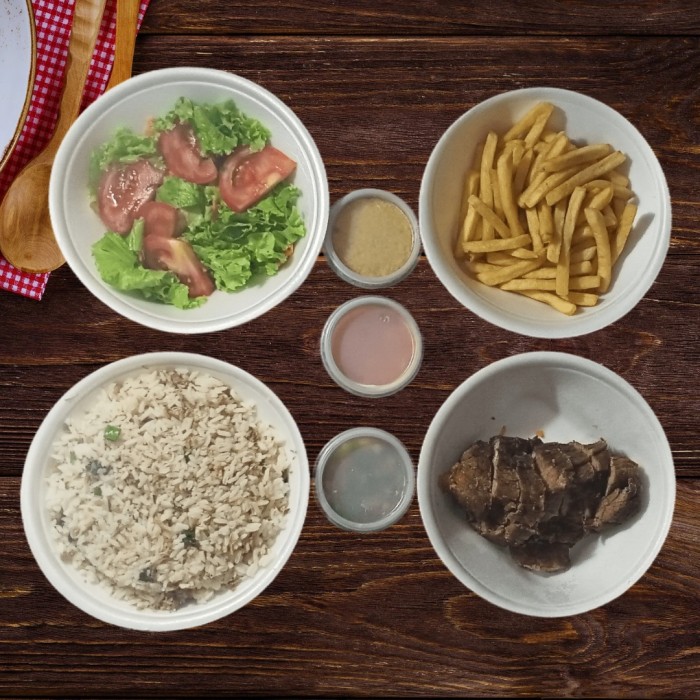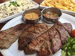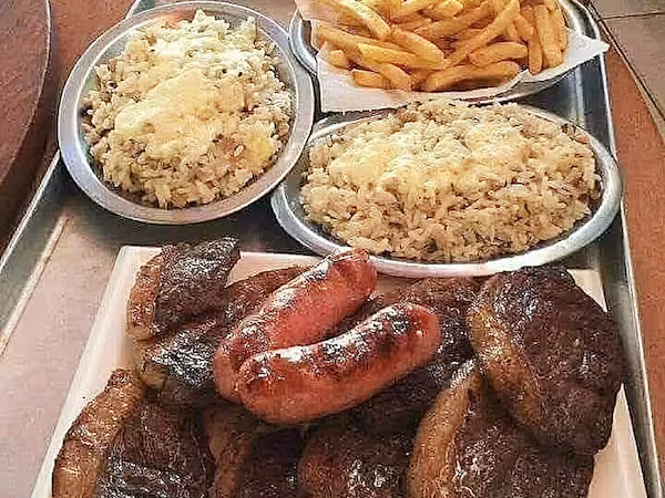 200g picanha, 200g maminha, 200g carne do sol, 200g costelinha, 2 Linguiça, 2 porção baião ou arroz branco, 1 porção batata frita, vinagrete e farofa.