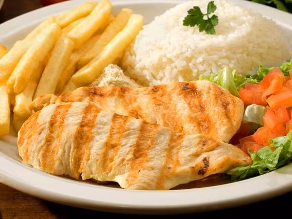 Um prato com 150g de filé de frango grelhado na chapa, mantendo a suculência e o sabor característicos. Acompanha baião autêntico, batata frita dourada, vinagrete colorido e uma farofa que enriquece a experiência.