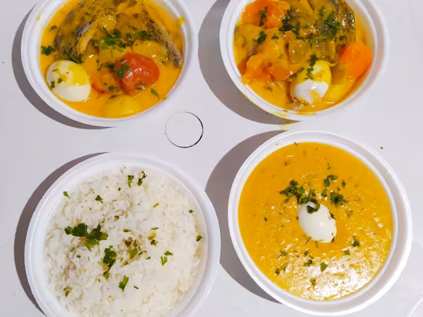 Uma iguaria saborosa! Delicie-se com a Tilápia cozida ao leite de coco e legumes, acompanhada de arroz branco e um pirão cremoso. Uma combinação que oferece um verdadeiro sabor à beira-mar