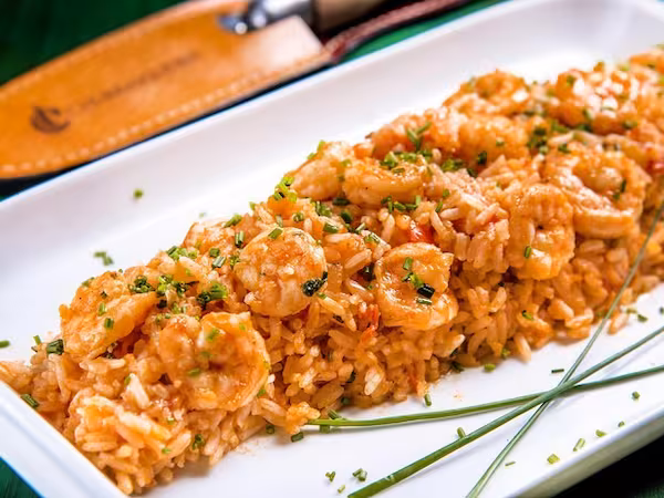 Delicie-se com nossa especialidade: camarão empanado e gratinado com queijo, servido com um arroz à grega rico em sabores e textura. Acompanhado de uma generosa porção de batata palha crocante, este prato oferece uma combinação irresistível de crocância e cremosidade. Perfeito para compartilhar e apreciar a dois, proporcionando uma experiência gastronômica única e memorável