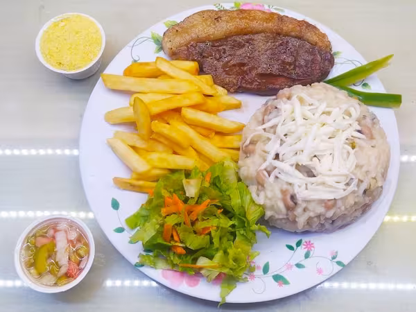 Saboreie 150g de maminha grelhada na brasa, trazendo a autenticidade do churrasco para cada mordida. Acompanha baião saboroso, batata frita dourada, vinagrete colorido e uma farofa que adiciona um toque de crocância à refeição.